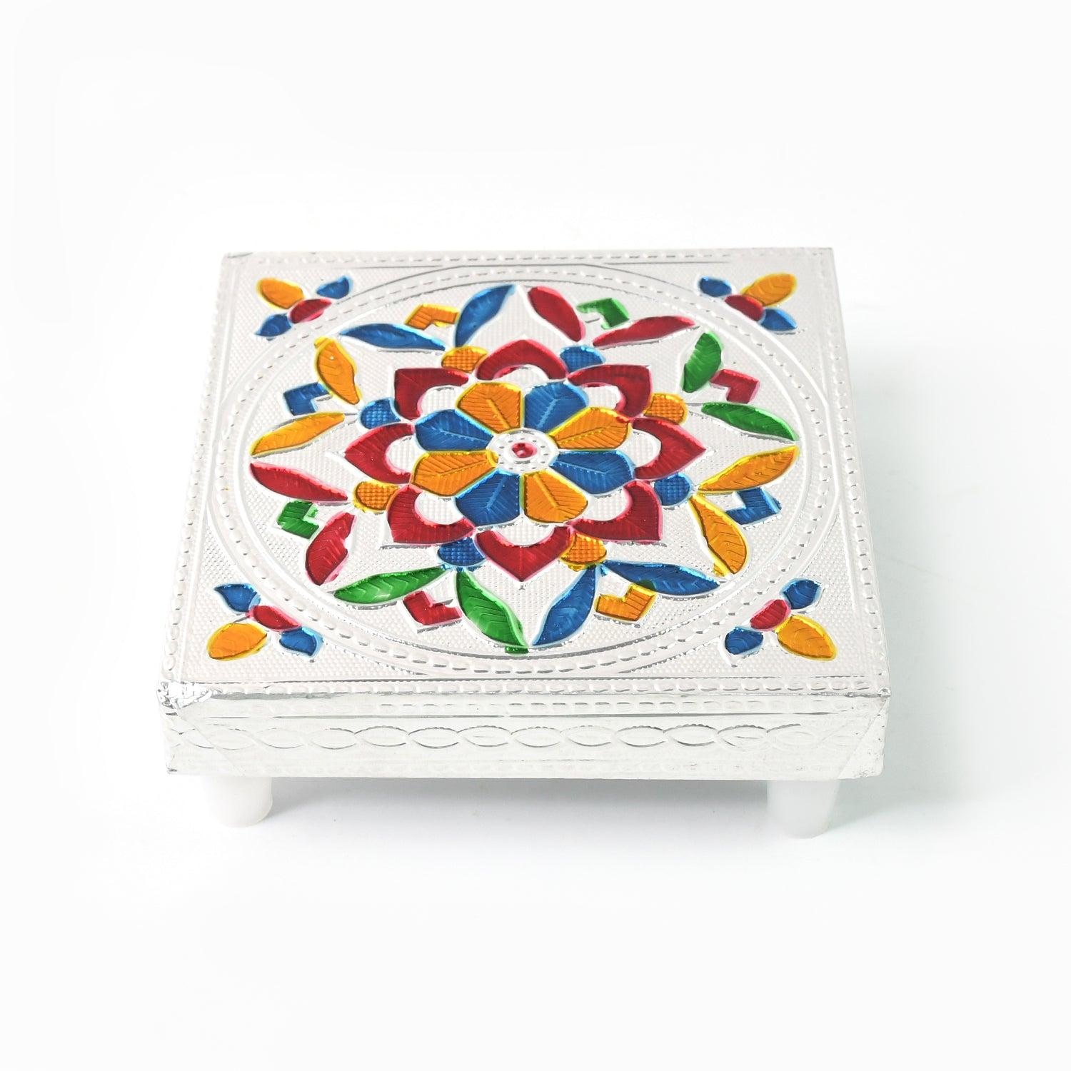 1 Pc Meenakari Wooden Chowki & Bajot Set: For Home & Office Puja (Multicolor)
